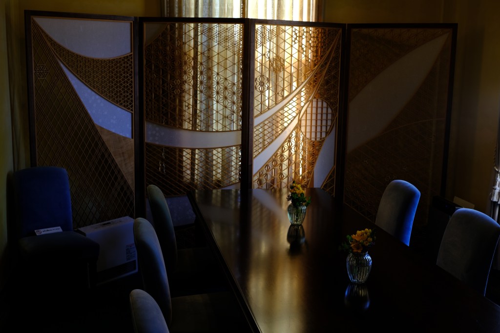 He took over responsibility for the company from his father who started the company in the 1950s and is still actively involved. Although the construction of traditional style Japanese houses is declining, a new trend of incorporating kumiko designs into modern architecture has emerged. Many of Inomata-san’s unique designs have found their way into contemporary residences and Japanese restaurants. A fine example of kumiko is an Inomata design for Joetsu’s premier kaiseki restaurant “Ukiyo”.
