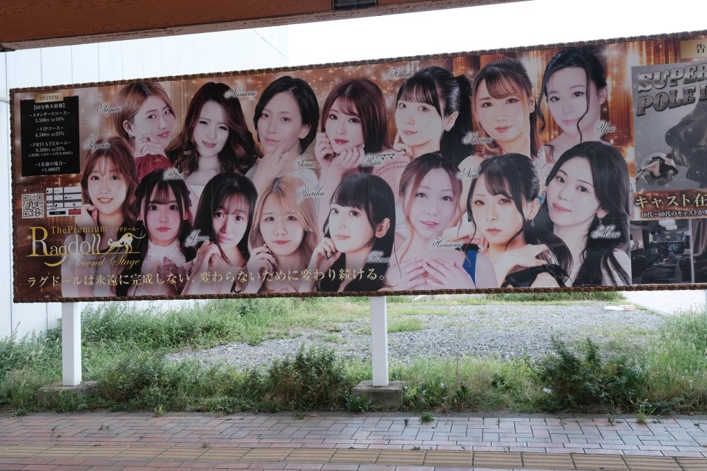 However, what does the plaza in front of the station have to offer, other than taxis? A large advertising board for a hostess club.